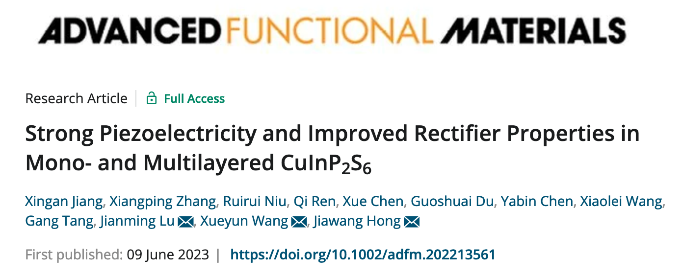 洪家旺教授、王学云副教授团队报道了单原子层厚度的二维范德瓦尔斯CuInP2S6铁电材料面外强压电性效应以及增强的电流自整流特性,相关成果以“Strong Piezoelectricity and Improved Rectifier Properties in Mono- and Multilayered CuInP2S6”为题,发表于国际顶级学术期刊《Advanced Functional Materials》。